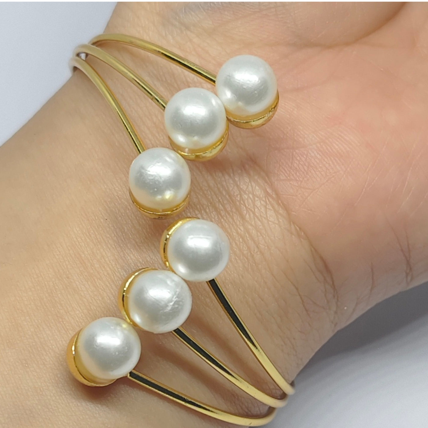 a perfect fusion of simplicity and sophistication. Designed with lustrous white faux pearls set on a sleek golden frame, this adjustable bangle offers a refined statement for any outfit.