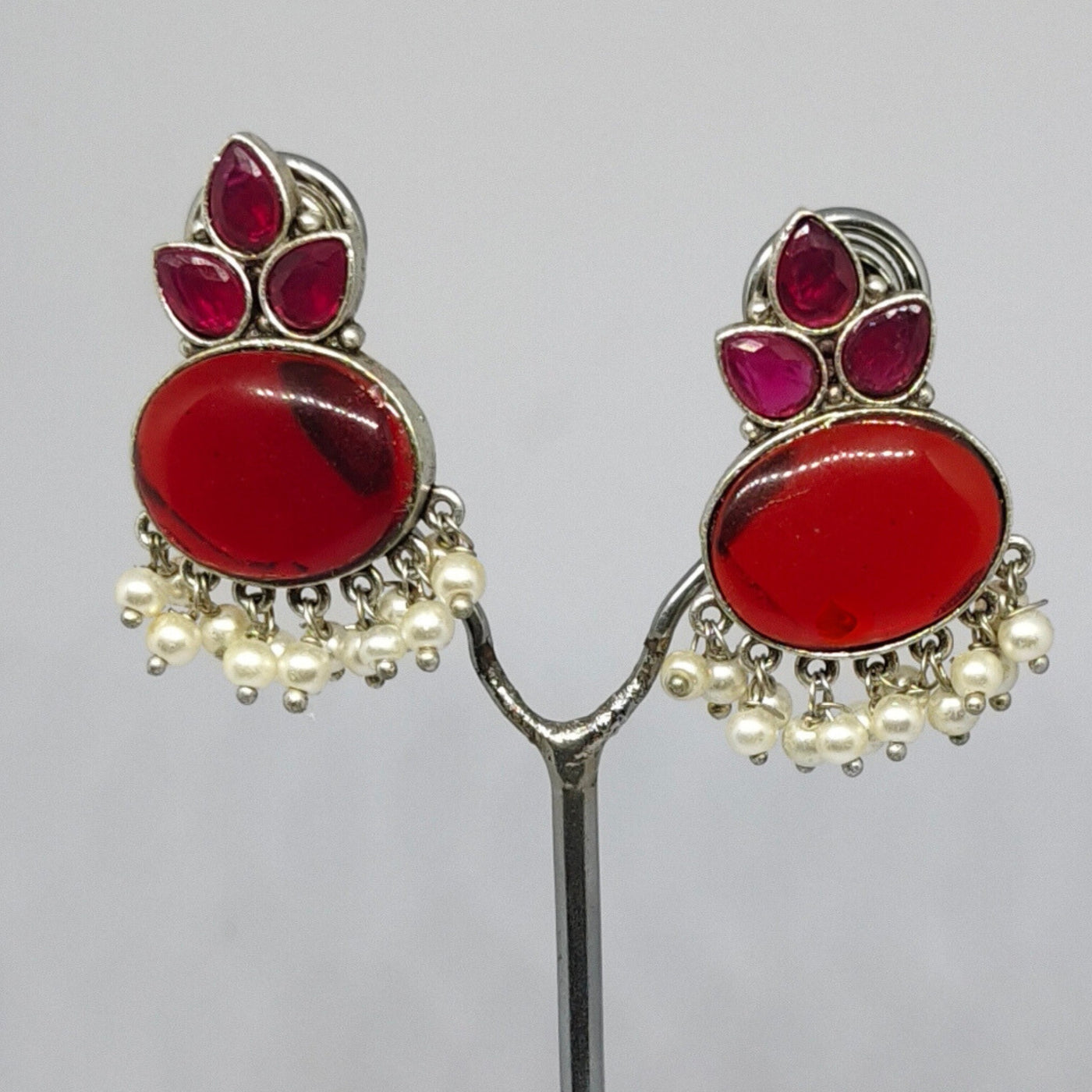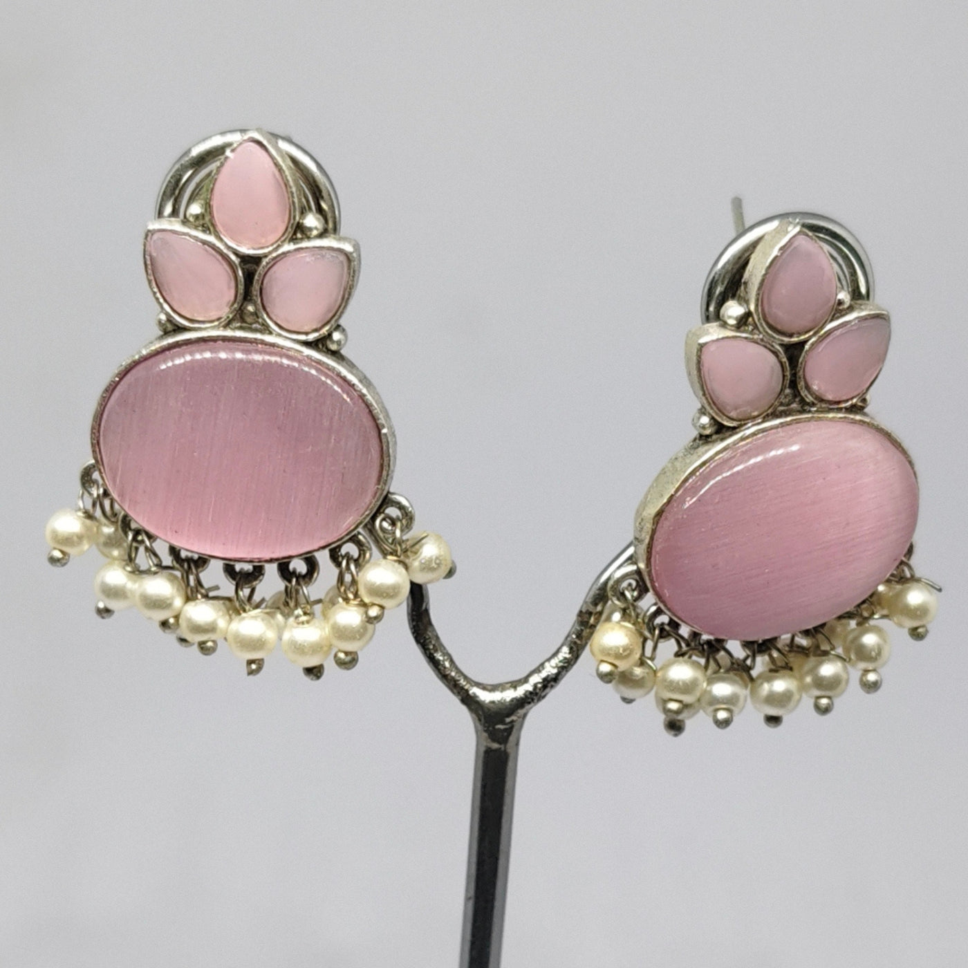 Monalisa Stone & Pearl Drop Earrings Add a touch of elegance to your outfit with these handcrafted Monalisa stone earrings featuring silver plating and delicate pearl drops. Perfect for weddings, parties, or festive occasions, these lightweight statement earrings blend traditional charm with modern style.