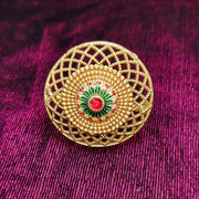 Make a bold ethnic statement with this Gold-Plated Jali Work Statement Ring, featuring intricate handcrafted lattice detailing and a striking red center stone with green enamel accents. Inspired by traditional Indian jewellery, this adjustable designer ring blends vintage elegance with modern styling. Perfect for festive wear, weddings, cultural events, and ethnic outfits, it adds regal charm to any look.