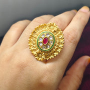 Kashmiri Kundan Style Gold-Plated Floral Statement Ring with Red Stone