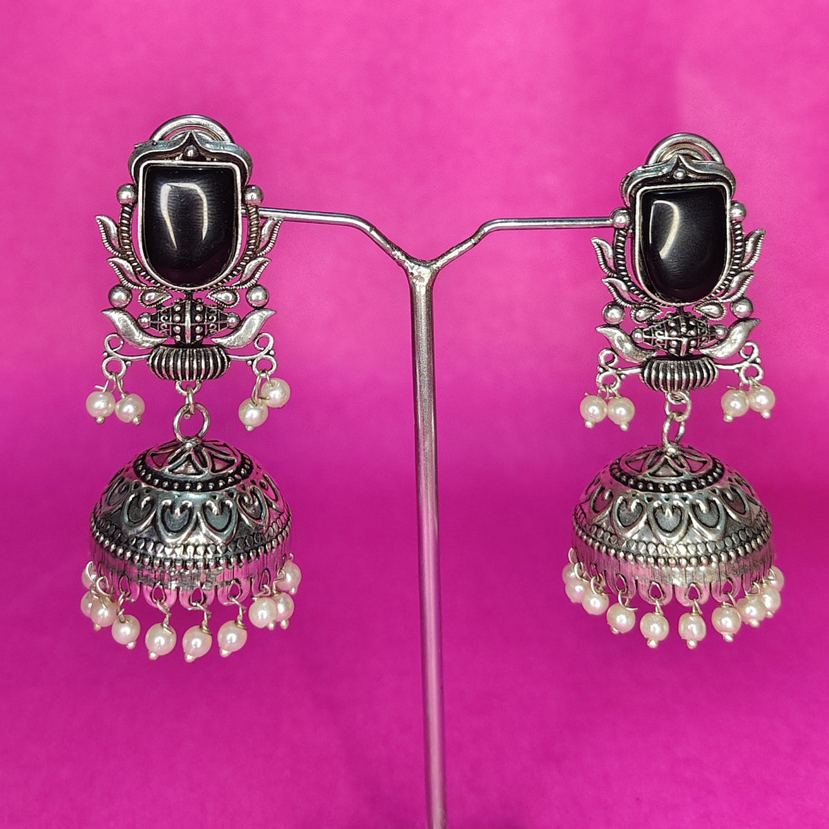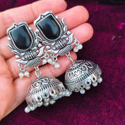 Bring elegance and tradition together with these stunning oxidized silver jhumka earrings featuring a bold stone center piece and delicate pearl bead danglings. Designed with intricate carvings and antique detailing, these earrings perfectly complement ethnic outfits like sarees, kurtis, and lehengas. Lightweight yet eye-catching, they’re ideal for weddings, parties, festive occasions, and everyday wear. A timeless piece of boho-chic oxidized jewelry every woman must own.