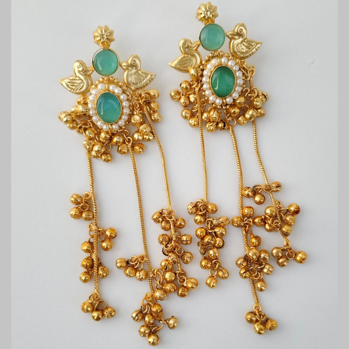 These Viral Kashmiri Gold-Plated Long Jhumka Earrings feature beautiful mint green stones, intricate duck motifs, and a handcrafted oval centrepiece surrounded by delicate pearls. The multi-layered long chain tassels with golden ghungroo drops create a royal, graceful movement, making them perfect for weddings, festivals, parties, and traditional celebrations. These ethnic bridal dangler earrings pair effortlessly with sarees, lehengas, and Indo-Western outfits, offering a unique blend of Kashmiri craftsmanship and contemporary charm.