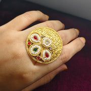 Make a bold statement with this Kashmiri gold plated statement ring, handcrafted with kundan stones, pearls, and traditional ethnic detailing. This adjustable bridal ring for women is perfect for weddings, festive wear, and traditional outfits. Shop handmade Kashmiri jewelry, kundan pearl rings, ethnic Indian rings, bridal statement jewelry, and designer gold plated accessories for timeless elegance and high fashion appeal.