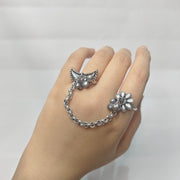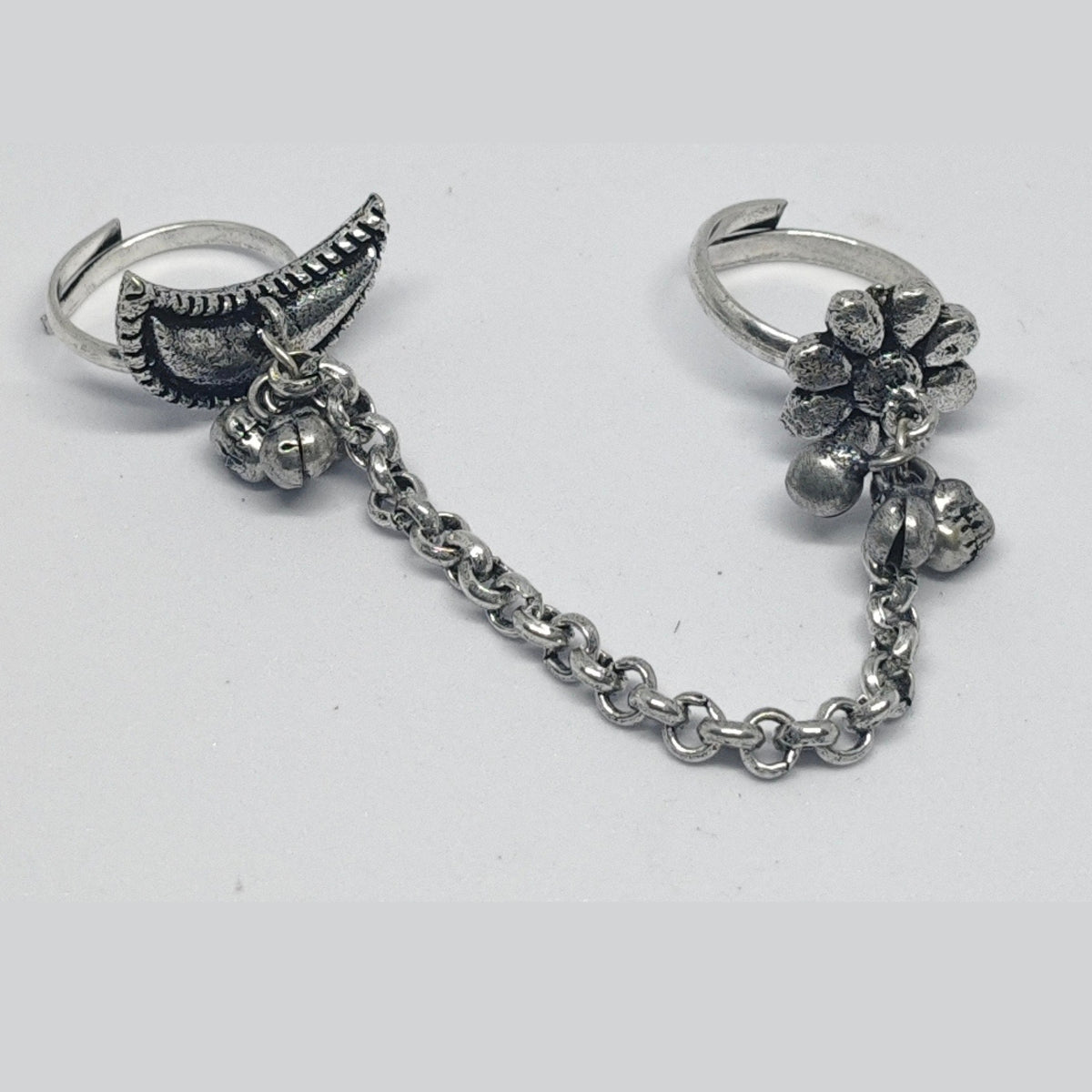 Key Features: Oxidized silver double finger ring with chain connector Unique moon & floral design with fine detailing Adjustable size for a perfect fit Lightweight, durable & skin-friendly Perfect for festivals, parties, casual & fusion wear Ideal fashion accessory for women & girls