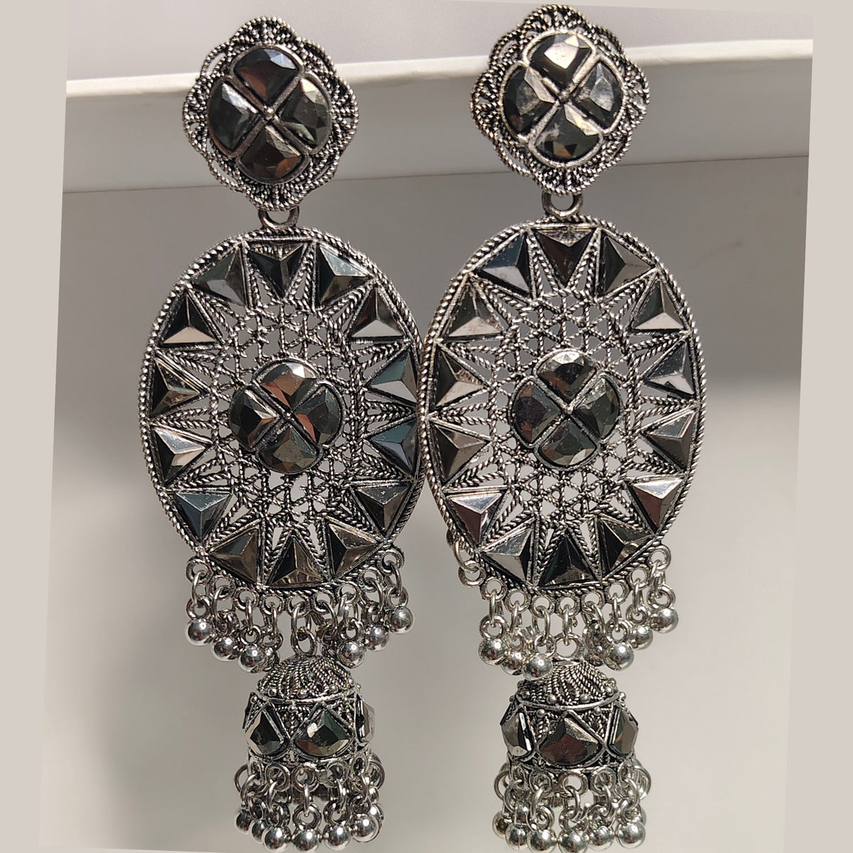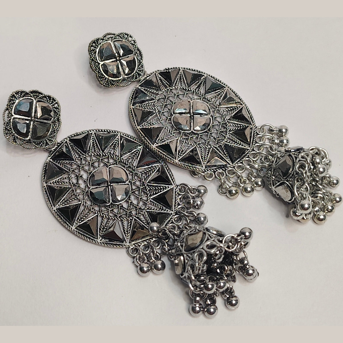 Enhance your ethnic charm with these Antique Silver Oxidised Metal Earrings designed for women and girls. Featuring an intricate oval-shaped...
